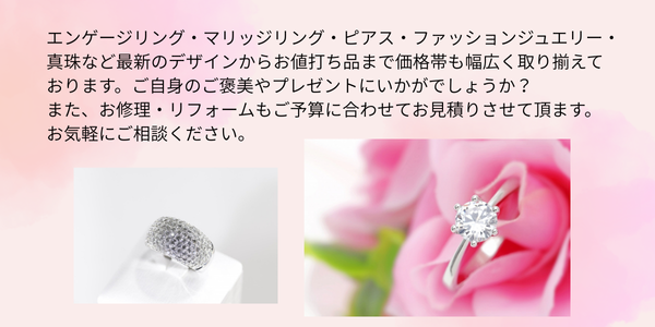 日常使いのジュエリーから冠婚葬祭用のパールネックレス・マリッジリングなど取り揃えております。